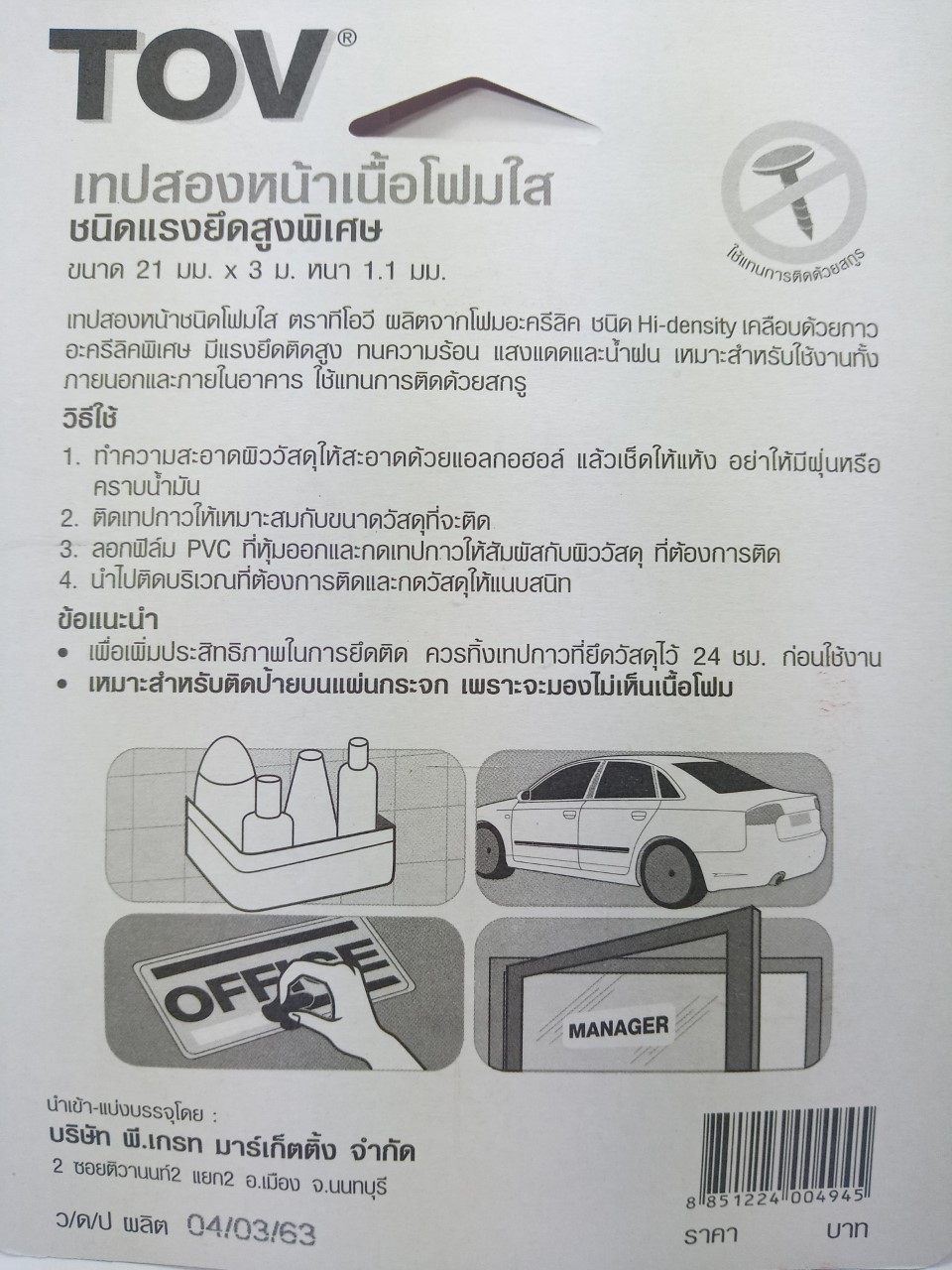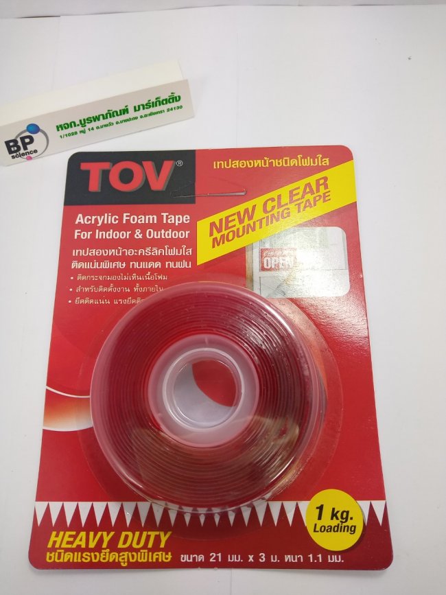 เทปสองหน้าชนิดใส ตรา TOV Acrylic Foam Tape For Indoor & Outdoor HEAVY DUTY ชนิดแรงยึดสูงพิเศษtov รหัส : 472 ราคา : 0 .- ประเภท : เทปกาว เทปสองหน้าชนิดใส ตรา TOV Acrylic Foam Tape For Indoor & OutdoorHEAVY DUTY ชนิดแรงยึดสูงพิเศษ