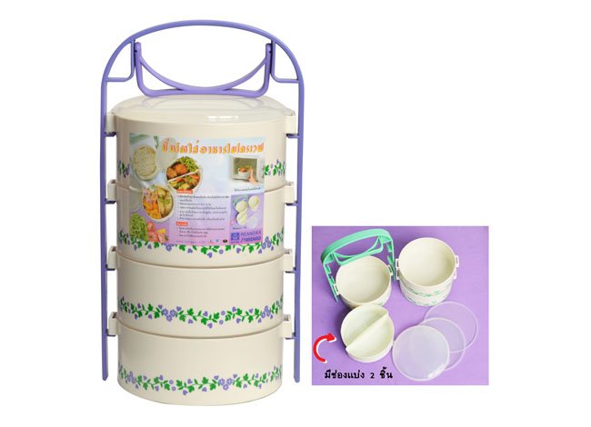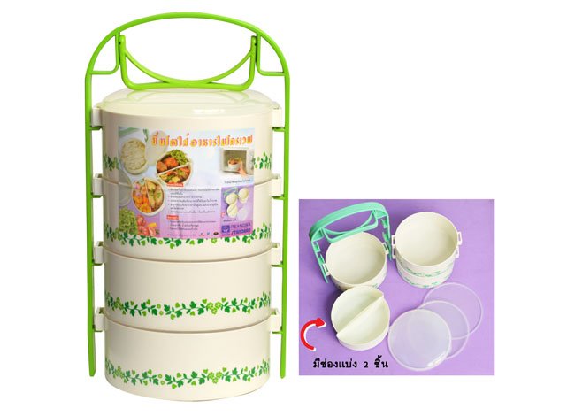 ปิ่นโตไมโครเวฟมีช่องเเบ่ง 2ช่อง 4 ชั้น ลายใบไม้หูหิ้วสีเขียว 150 x 200 mm./900 ml. x 4 รหัส : 698 ราคา : 0 .- ประเภท : ปิ่นโต