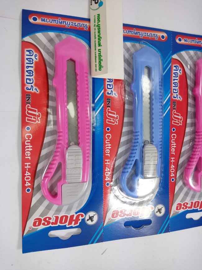 มีดคัตเตอร์ ขนาดใหญ่ (แพ็ค2อัน) ตราม้า H-404 รหัส : 713 ราคา : 35 .- ประเภท : กรรไกร/คลิปหนีบ มีดคัตเตอร์ ขนาดใหญ่ (แพ็ค2อัน) ตราม้า H-404แบรนด์ : ตราม้า มีดคัตเตอร์ ตราม้า H-404 ด้ามคละสี ใบมีดผลิตจากโลหะคุณภาพดี ทำมุม 45 องศา ตัดได้เรียบคม ด้ามจับพลาสติกชนิดพิเศษ แข็งแรง จับกระชับมือ ปลอดภัยด้วยระบบ Auto Lock Slider ป้องกันใบมีดเลื่อนกลับขณะใช้งาน มีคลิปหนีบเพื่อการพกพา ปลายคลิปหนีบใช้เป็นที่หักใบมีดได้ รองรับใบมีดขนาดมาตรฐาน 18 มม. ใช้สำหรับตัดกระดาษ พลาสติก งานตัดทั่วไปและงานออกแบบ-ประดิษฐ์ บรรจุ 2 อัน/แพ็ค ฿35.00 ข้อมูลสินค้ามีดคัตเตอร์ ขนาดใหญ่ (แพ็ค2อัน) ตราม้า H-404
